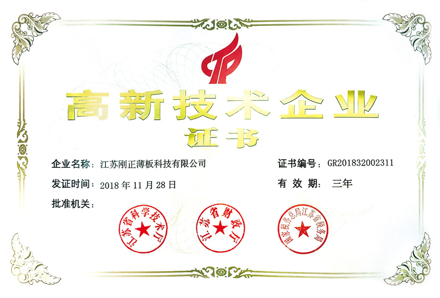 熱烈祝賀江蘇剛正薄板科技有限公司被認(rèn)定為高新技術(shù)企業(yè)