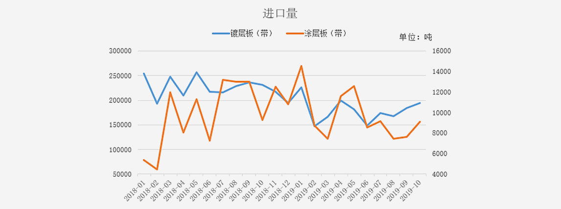 從進(jìn)口方面來(lái)看,據(jù)海關(guān)數(shù)據(jù)統(tǒng)計(jì)顯示,鍍鋅板卷10月份進(jìn)口量為19.4萬(wàn)噸,較上月增加1萬(wàn)噸,較去年同期下降3.6萬(wàn)噸;彩涂板卷10月份進(jìn)口量為0.91萬(wàn)噸,較上月增加0.15萬(wàn)噸,較去年同期下降0.01萬(wàn)噸。