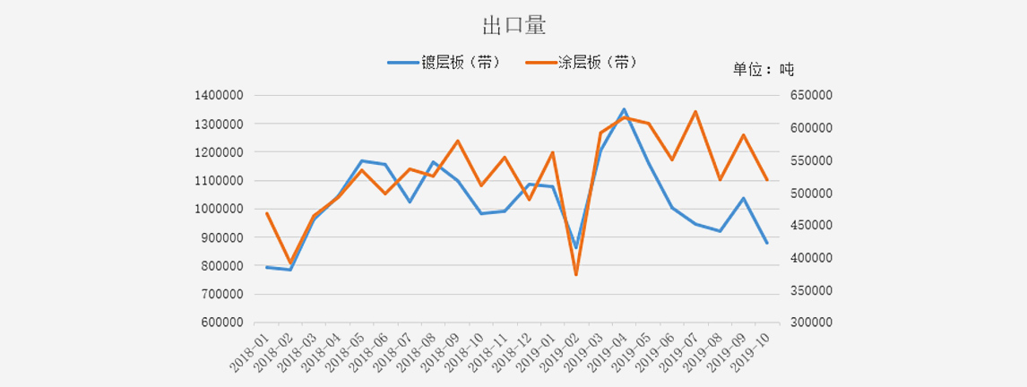 從出口方面來(lái)看,據(jù)海關(guān)數(shù)據(jù)統(tǒng)計(jì)顯示,鍍鋅板卷10月份出口量為88.01萬(wàn)噸,較上月減少15.77萬(wàn)噸,較去年同期下降10.4萬(wàn)噸;彩涂板卷10月份出口量為52.03萬(wàn)噸,較上月減少6.82萬(wàn)噸,較去年同期增加0.94萬(wàn)噸。