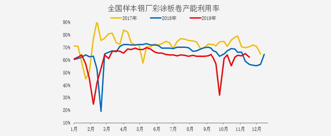 對(duì)于彩涂板卷而言,11月企業(yè)生產(chǎn)狀態(tài)有所下降,主要在于冬季來(lái)臨,訂單不佳使得達(dá)產(chǎn)情況走低,但是今年暖冬效應(yīng)所致,整體水平好于去年同期水平。