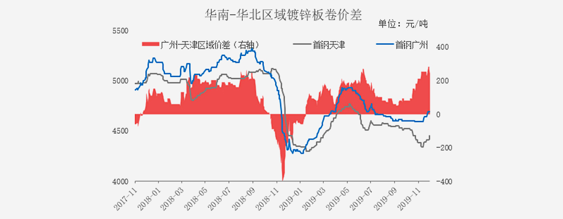 圖10:鍍鋅板卷華南-華北區(qū)域價(jià)差情況